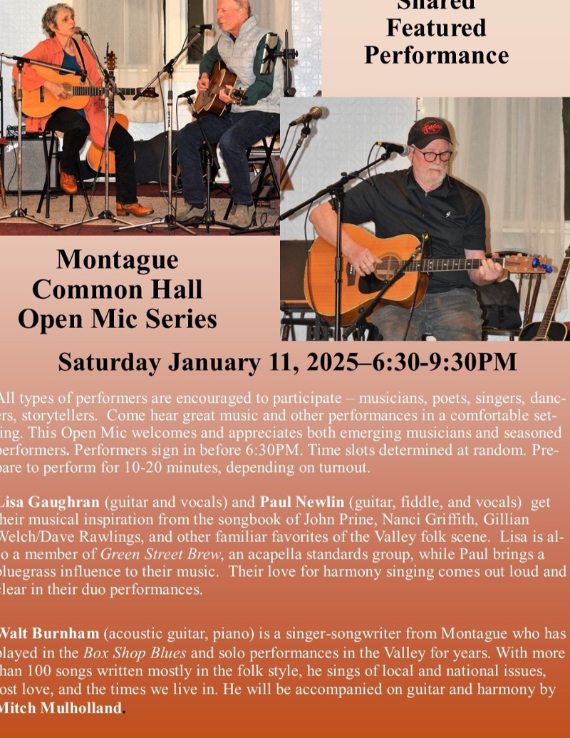Walt Burnham (acoustic guitar, piano) is a singer-songwriter from Montague who has played in the Box Shop Blues and solo performances in the Valley for years. With more than 100 songs written mostly in the folk style, he sings of local and national issues, lost love, and the times we live in. He will be accompanied on guitar and harmony by Mitch Mulholland.